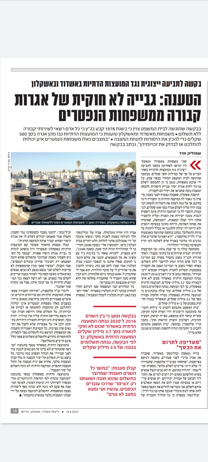 אסורה גביית אגרה מקרובי נפטרים: ייצוגית נגד המועצה הדתית באר שבע